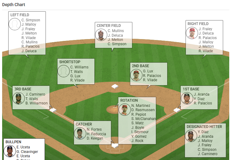- Build depth charts by position and role (SP/RP, IF/OF, etc.)