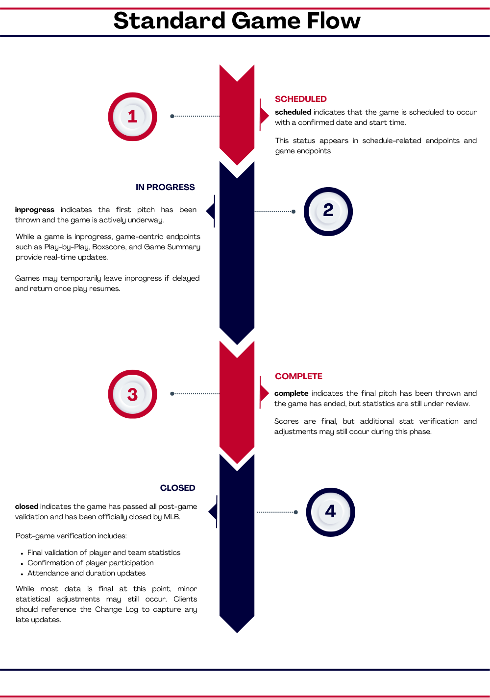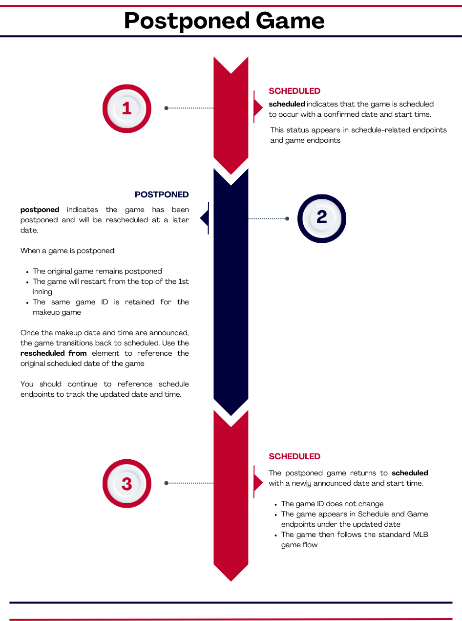Every MLB game progresses through multiple statuses during its lifecycle. Leverage the game status to determine the appropriate endpoint to use.