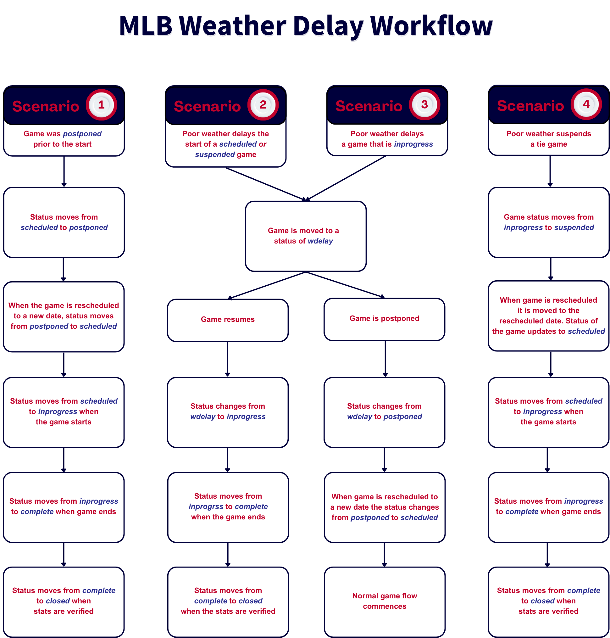 Use the below diagram to understand possible game workflows for an MLB weather delay. Or access a pdf.