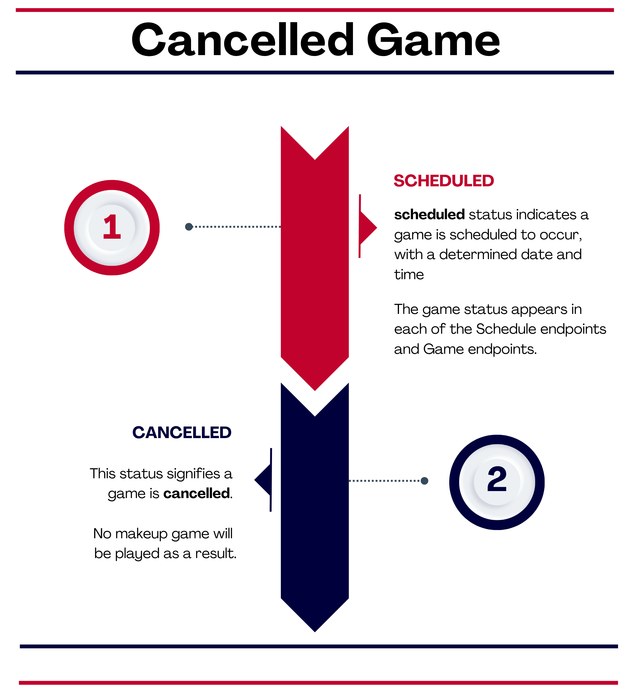 scheduled- The game is scheduled to occur.created– The game has been created and we have begun logging information.inprogress– The game is in progress.halftime- The game is currently at halftime.complete– The game is over, but stat validation is not complete.closed– The game is over and the stats have been validated.cancelled– The game has been cancelled. No makeup game will be played as a result.delayed– The start of the game is currently delayed or the game has gone from in progress to delayed for some reason.postponed– The game has been postponed, to be made up at another day and time. Once the makeup game is announced, a new game and ID will be created and scheduled on the announced makeup date.time-tbd– The game has been scheduled, but a time has yet to be announced.if-necessary– The game will be scheduled if it is required.unnecessary– The series game was scheduled to occur, but will not take place due to one team clinching the series early.