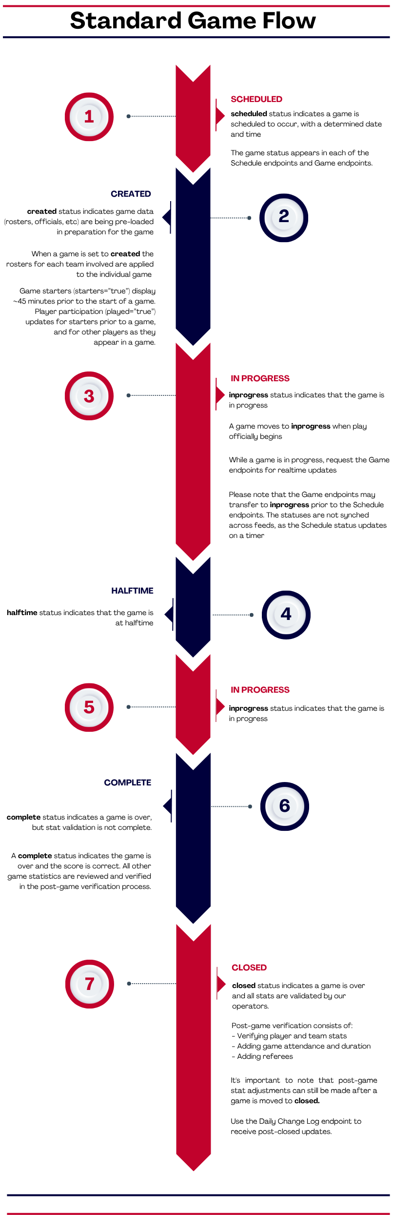 scheduled- The game is scheduled to occur.created– The game has been created and we have begun logging information.inprogress– The game is in progress.halftime- The game is currently at halftime. Although Unrivaled uses a 3-on-3 format, halftime appears in the API the same way it does for 5-on-5 basketball products.complete– The game is over, but stat validation is not complete.closed– The game is over and the stats have been validated.cancelled– The game has been cancelled. No makeup game will be played as a result.delayed– The start of the game is currently delayed or the game has gone from in progress to delayed for some reason.postponed– The game has been postponed, to be made up at another day and time. Once the makeup game is announced, a new game and ID will be created and scheduled on the announced makeup date.time-tbd– The game has been scheduled, but a time has yet to be announced.if-necessary– The game will be scheduled if it is required.unnecessary– The series game was scheduled to occur, but will not take place due to one team clinching the series early.
