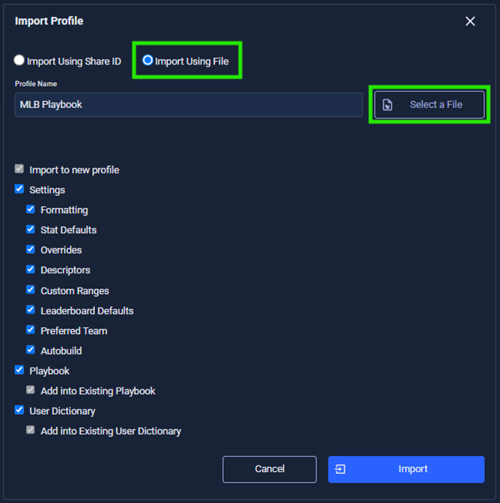 These settings will replace all existing content in your Playbook and User Dictionary with the contents of your import. We recommend using these settings when importing a full new profile to match a network master file.
