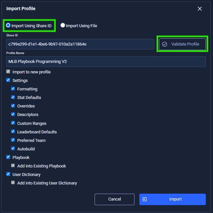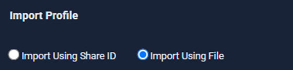 When importing a profile via Share ID, select Import Using Share ID and paste the ID in the field below. Once the ID has been pasted in, click Validate Profile. When the profile is validated, you can edit the profile name if needed and select which parts of the profile that you would like to import via the check-box options.