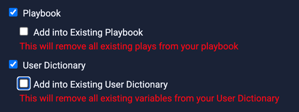 Please be aware of the settings below when importing Playbook pages and User Dictionary entries, especially when importing into a profile that already contains content in these areas.