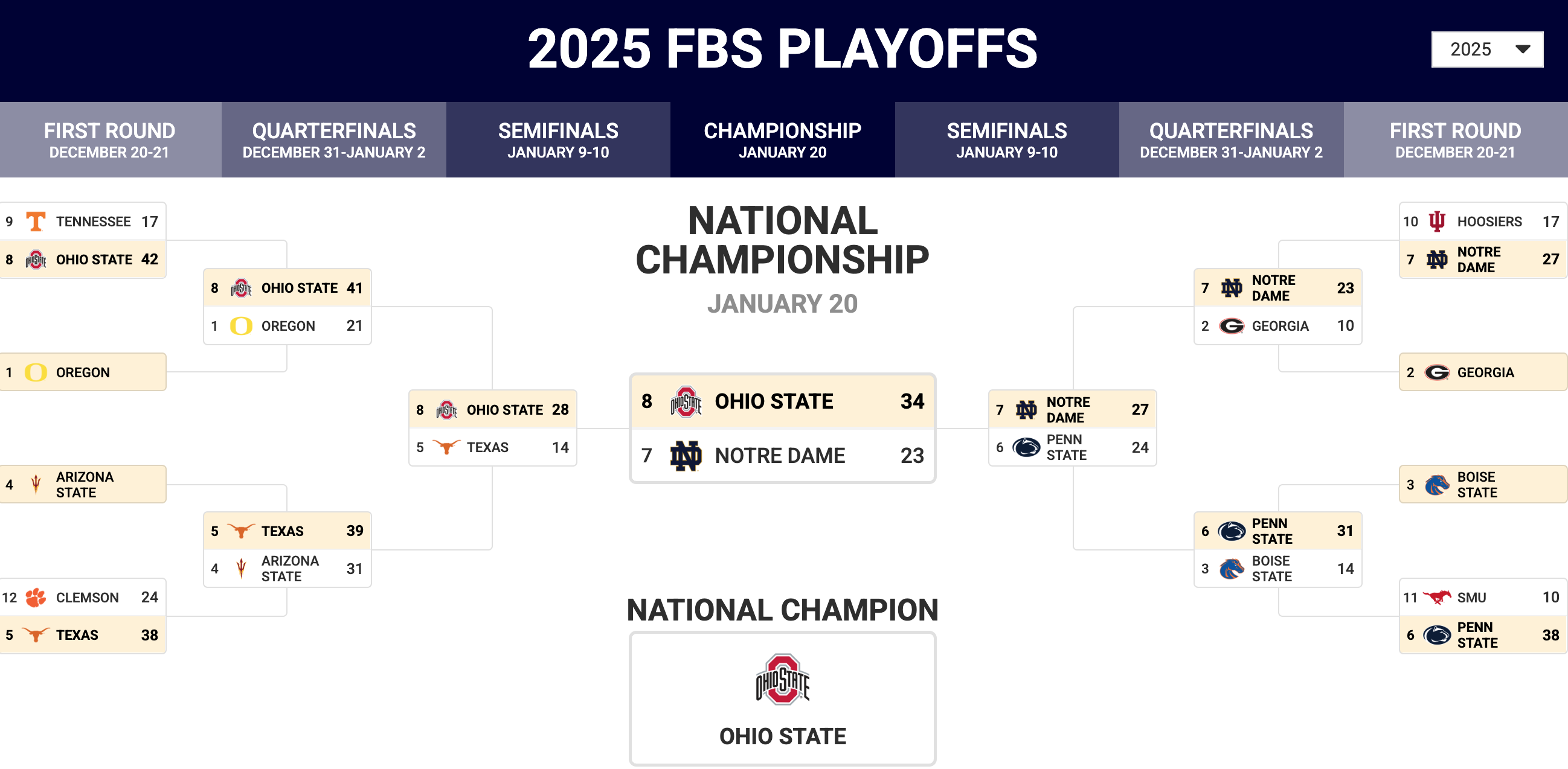 The below image depicts a bracket of matchups for the 2025 FBS College Football Playoff. Leverage the above endpoints to create a similar visual in your solution.