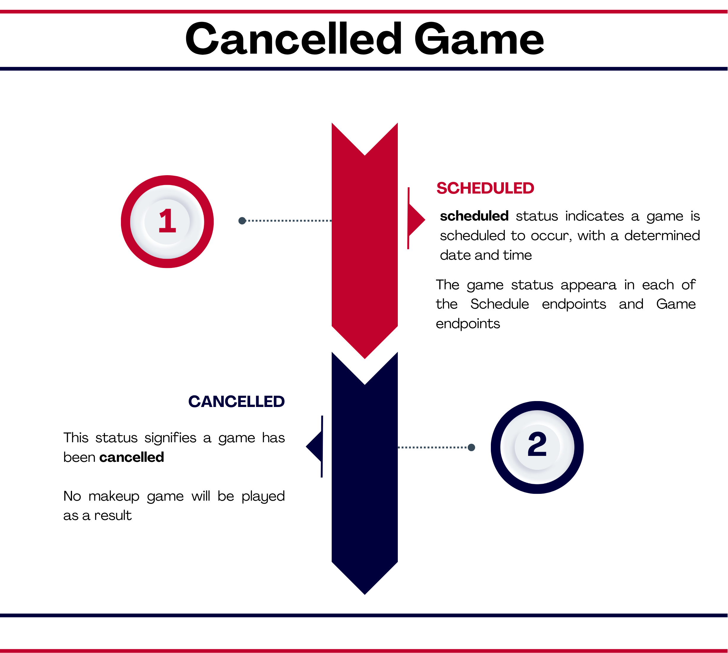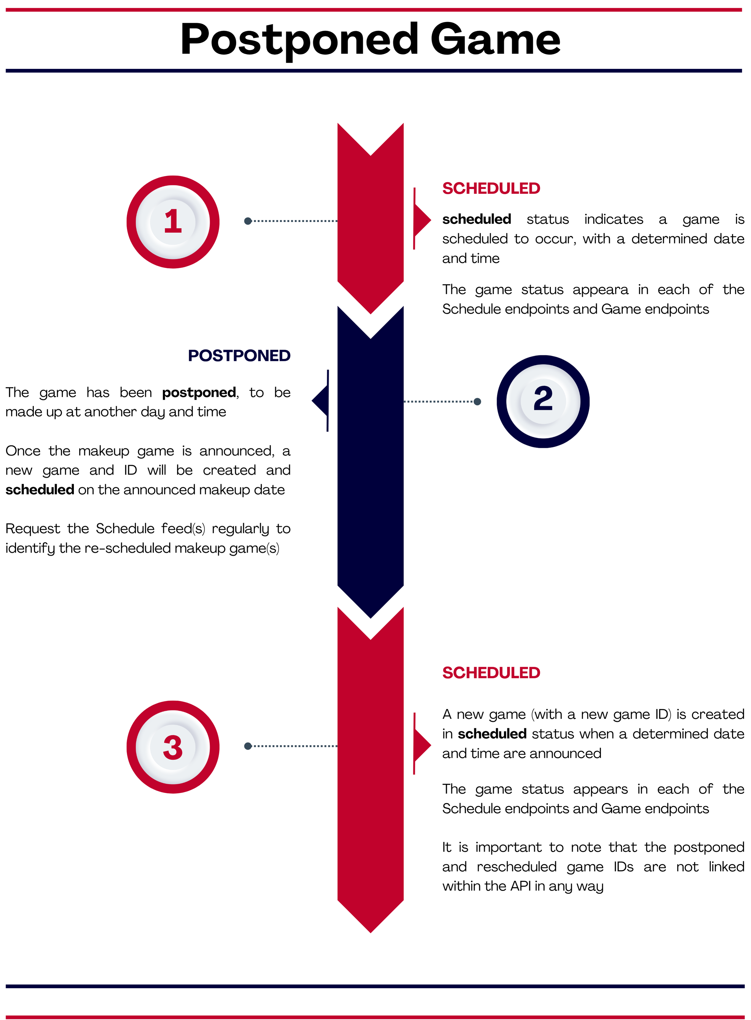 – The game has been postponed, to be made up at another day and time. Once the makeup game is announced, a new game and ID will be created and scheduled on the announced makeup date. You should request the Schedule feed(s) regularly to identify the re-scheduled makeup game(s).delayed