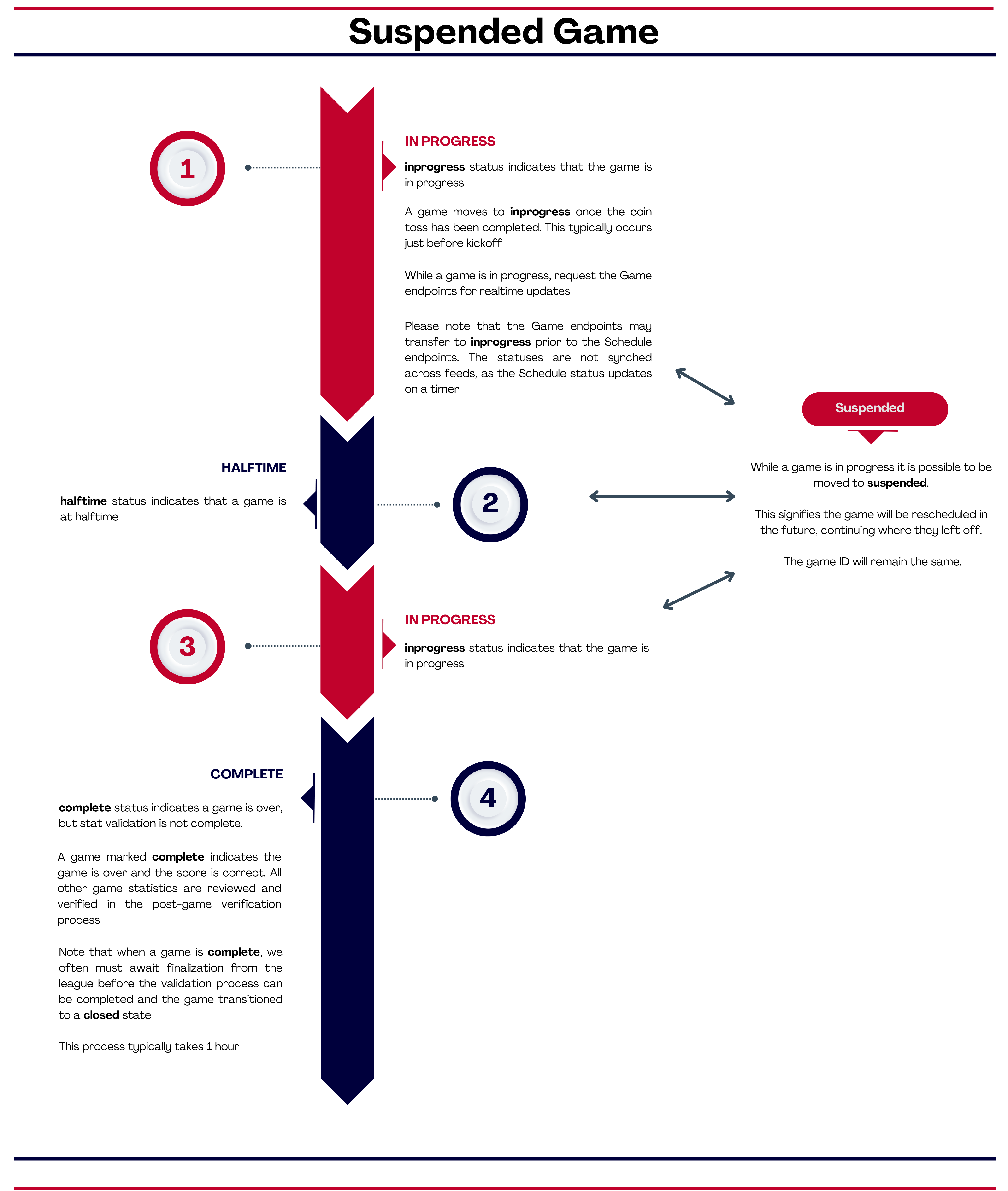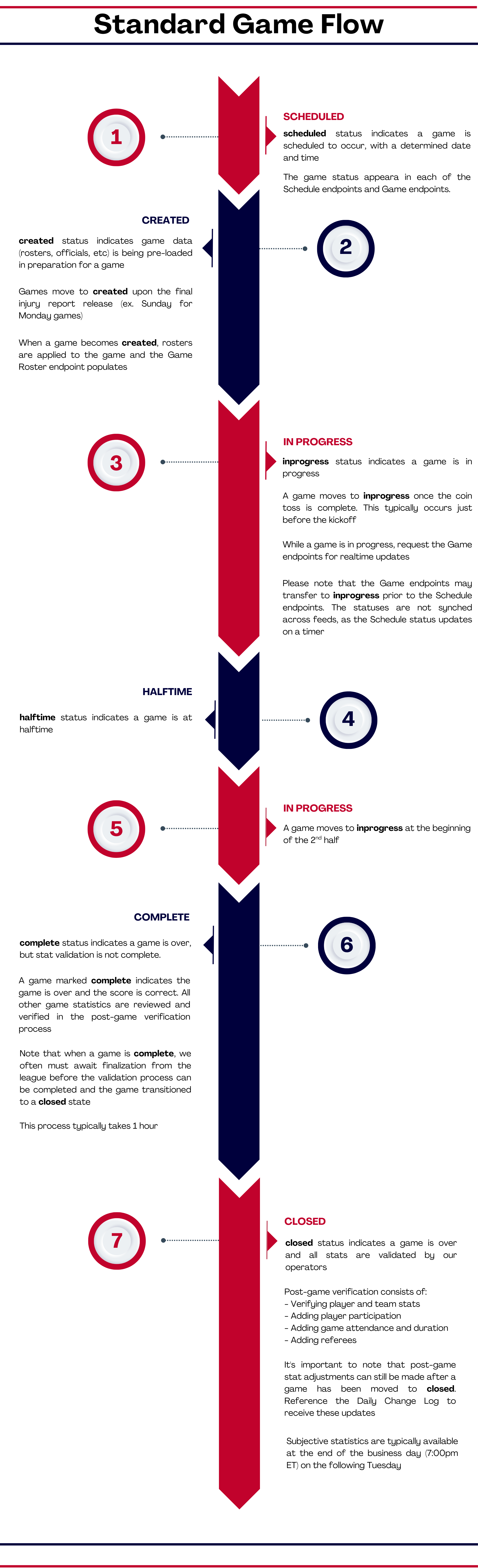 Below are each of the valid game statuses you can expect to see in the NFL API. Reference these definitions for precise detail on what each game state signifies.