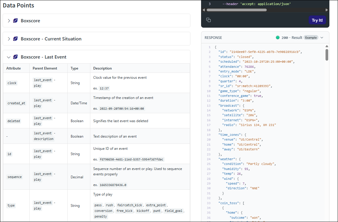 - Sandbox: Interactive sandbox for browsing our sports data. Configure your desire path, paste in your API access key, and click 'Try It' to see results. Or click the
