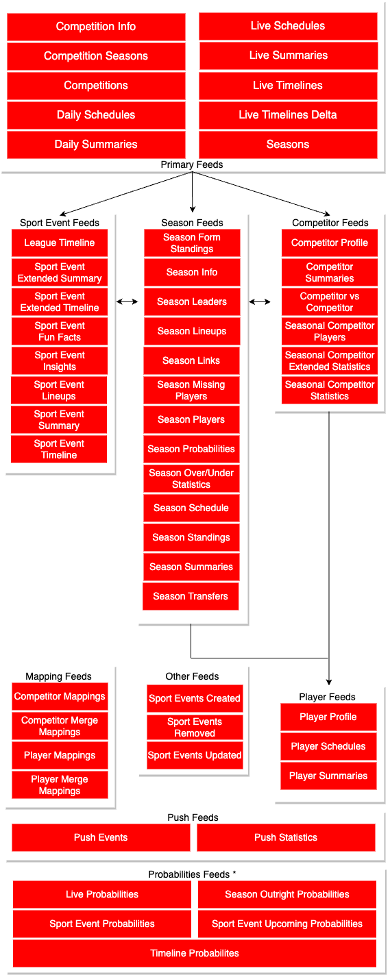 Primary and mapping feeds only require dates, human-readable parameters or a Competition Id (which can be found in the competitions endpoint), while other feeds require a global unique identifier (GUID) to identify the sport event, competitor, or player that the feed will describe. The primary feeds provide GUIDs for sport events, competitions, and competitors, while sport event and competitors provide GUIDS for players.